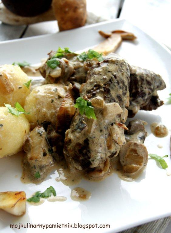 Sezon grzybowy się zakończył, u nas w tym roku to był praktycznie pierwszy sezon bo zmiana miejsca zamieszkania na sąsiedztwo lasu spowodowała ze maż w końcu zrealizował swoje obietnice i regularnie chodził na grzyby. Parę razy udało mu się przynieść kilka fajnych okazów prawdziwków i część z nich postanowiłam wykorzystać do zrobienia swoich pierwszych rolad z grzybami. Chyba się powtarzam z tym "pierwszy":) W każdym razie wyszły obłędnie pyszne, z dodatkiem domowych pyz i śmietanowego sosu rewelacyjne. Polecam każdemu.